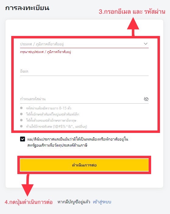 กรอกอีเมลล์ และ รหัสผ่าน เพื่อทำการสมัคร กดดำเนินการต่อ